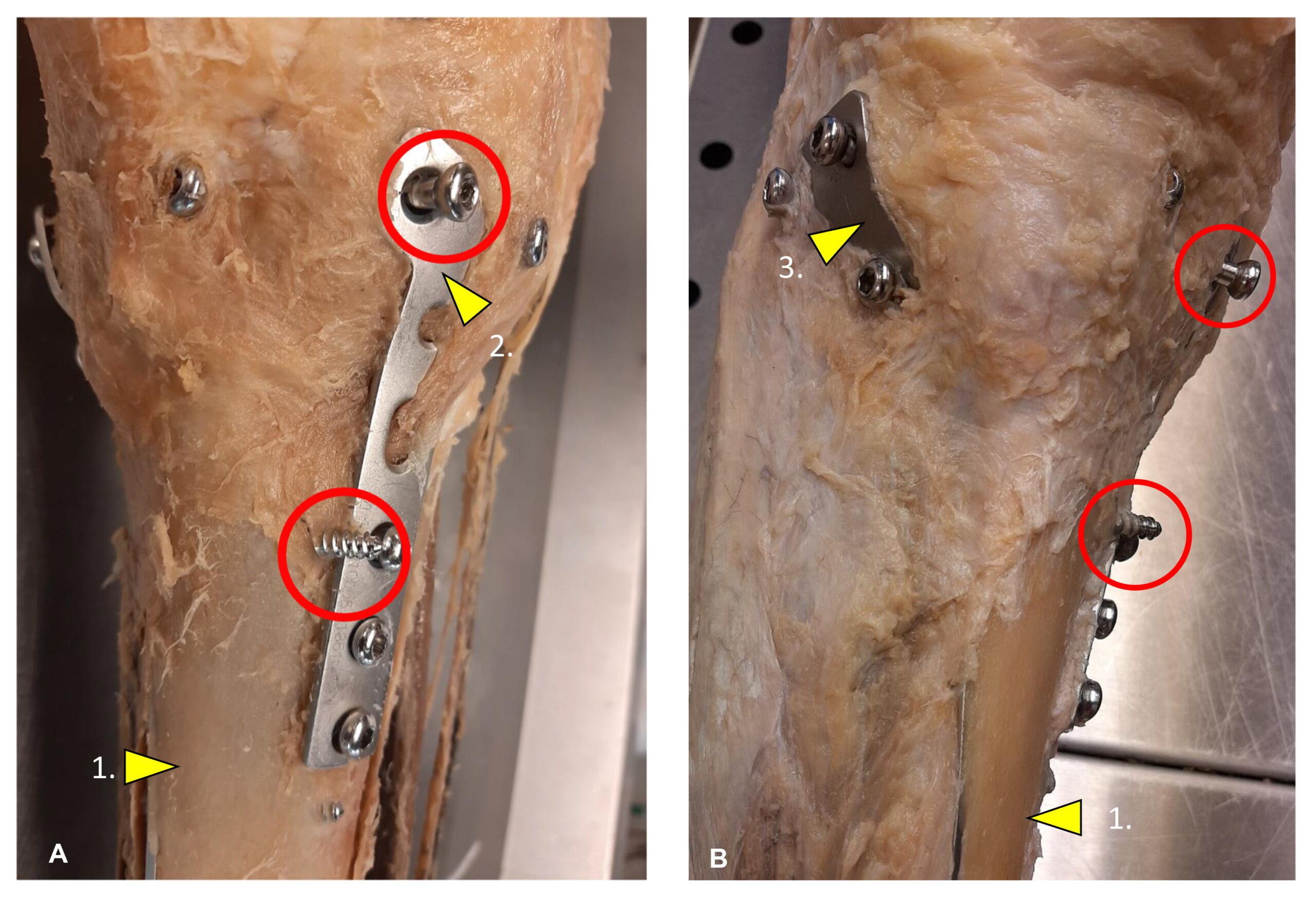 The donation of the body for anatomical examination took place according to the binding legal regulations. The cadaver was fixed with 10% formalin via the femoral artery at 1.2 bar pressure, and formalin was circulated in the body to reach the tissues. The cadaver was then placed into a 10 % formalin bath for 3 months. The preservation process was performed in accordance with the routine protocol of the Department of Anatomy, Histology and Embryology at the University of Debrecen, Hungary. After preservation, the lower limbs connected to the pelvis were separated at the level of the iliac crest, and the pelvis was halved in the sagittal plane. Dissection involved basic scalpels, scissors and forceps. Scar tissue covering the implanted plates and screws was removed with surgical scalpels. A Pean clamp was used to retract muscles and tendons.