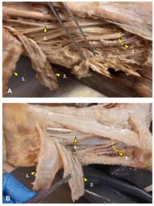 During dissection of the distal (crural and plantar) regions, tissues below the knee were fragile, likely due to transient acute compartment syndrome (Cleveland Clinic, 2024) or circulatory issues from popliteal artery compression (Fig. 3A). This limited our ability to fully dissect deeper vascular and nerve structures; the anterior tibial and fibular (peroneal) muscles were partially disintegrated, and the superficial fibular (peroneal) nerve was difficult to isolate (Figs. 3A, 3B). The plantar surface posed additional challenges: poor formalin fixation led to inadequate preservation, causing muscle tissue damage during dissection (Fig. 4A). In contrast, the opposite limb's sole was well-preserved (Fig. 4B), supporting the circulatory insufficiency theory, as formalin hadn't penetrated deeper layers. Despite this, vascular and nerve structures remained intact, though superficial plantar muscles were severely damaged. We did not dissect the popliteal artery or its branches to identify the cause of obliteration, prioritizing preservation of anatomical structures.