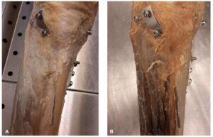 During the dissection of the lower limb, our primary goal was to expose the surgical area in such a way as to preserve the important anatomical structures while ensuring that the implanted screws and plates were clearly visible to demonstrate features of the healing process. Finally, our objective was to prepare the specimen for plastination so that it could be used for educational purposes for a longer duration.